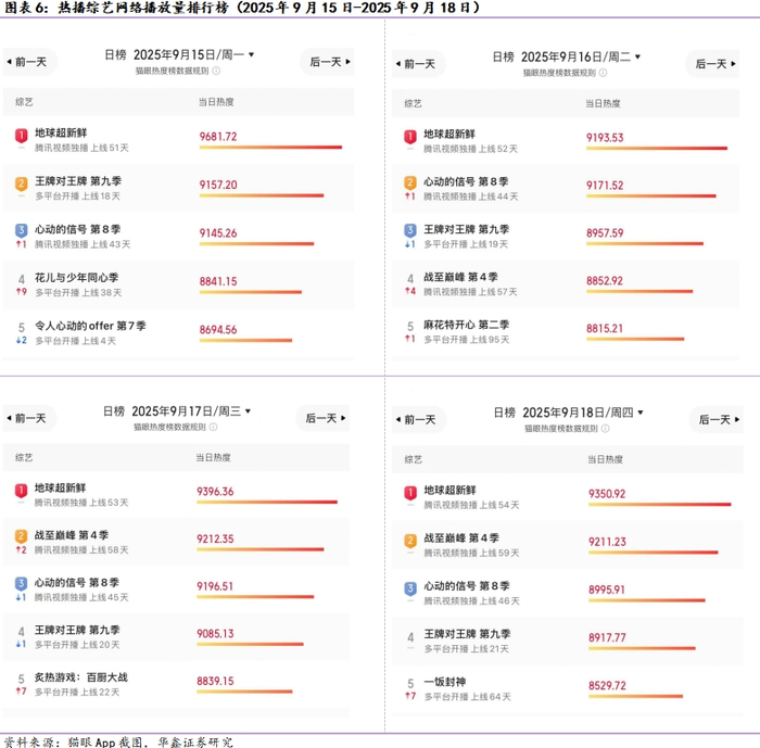 综艺节目方面,如下图所示,周度全网热度榜靠前的综艺有《地球超新鲜》、《战至巅峰 第四季》和《心动的信号 第八季》。