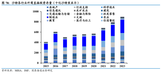 沙特产业结构转型:“2030愿景”推动下,近年沙特制造业、消费及中高新技术产业加速发展。经济呈现出新旧动能切换加快、市场与营商环境稳步修复的趋势,此外,在包括数字经济、绿色能源、高端制造、文化旅游等领域均取得实质性突破与进展。凭借较好的营商环境和开放程度,沙特近年吸引外商直接投资,FDI集聚效应日益凸显。制造业、建筑业、批发零售、交通运输与仓储、金融与保险等领域的外商投资存量基础持续增厚,且近年制造业投资占比显著提升,未来具备较高的投资潜力与空间。