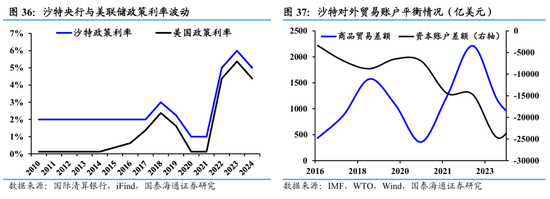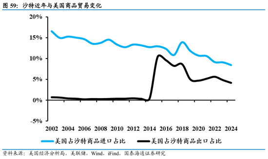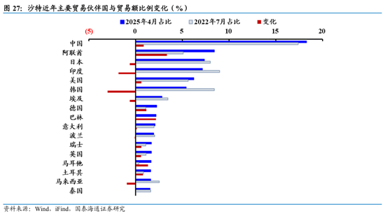 宏观经济指标持续改善,人口红利蕴含强发展动能。近年得益于非油经济带来的“缓冲效应”,沙特通胀对于原油价格波动的敏感度下降。失业率降至历史新低,沙特劳动力市场具备强动能:人口年龄年轻化、女性就业崛起、教育程度较高、外来人口扩张而劳动参与率较高,使得沙特后续发展具备较强的人口红利支持。国际收支结构整体保持稳定,近年来,沙特贸易顺差高企,仍以能源出口为主要贡献,同时非油出口占比提升。对外贸易关系上,近年中国持续为沙特第一大贸易合作伙伴国,而亚洲为沙特第一大贸易合作伙伴地区,国别上,近年沙特降低与日本、印度、韩国、马来西亚对外贸易比例,同时提升海湾国家的贸易份额。