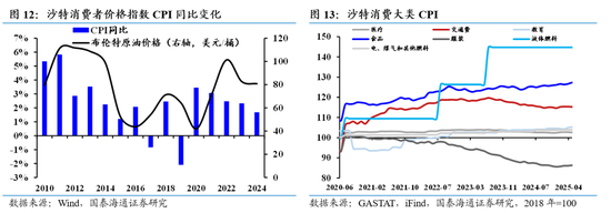 首先,从整体价格水平来看,2020年以前,CPI与国际油价走势呈现高度同步,二者波动方向基本一致,体现出能源价格对通胀水平的显著影响。然而,这一联动性自2020年起明显减弱。尽管2021–2023年间国际油价维持高位,布伦特原油价格一度突破每桶100美元,但沙特CPI却稳定在2.3%–3.0%的温和区间,通胀敏感性显著下降,反映出非油经济增长给沙特提供了对能源价格变化的“缓冲带”。