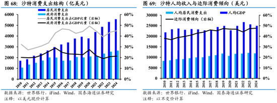人均消费支出稳步提升,消费意愿逐步增强。沙特人均GDP自2010年以来总体保持稳定,长期维持在高收入国家水平。同期,人均居民消费支出呈现稳步增长态势,边际消费倾向亦逐步上行,2024年升至历史高点0.48。这一趋势反映出在居民收入水平稳定或温和增长的背景下,居民倾向于将更多新增收入用于消费而非储蓄,消费意愿显著增强。人均消费能力与消费倾向的同步提升,正为沙特内需扩张和经济增长提供更加坚实的支撑。