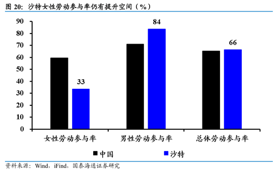 1)劳动力人口占比高,劳动率参与率达66%:根据世界银行数据,沙特总人口达3370万,劳动力人口占比近五成,显著高于以色列、阿联酋等中东地区主要经济体。