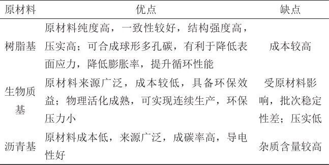 多孔碳由于来源广泛并且孔隙结构丰富而在CVD硅碳负极材料中备受关注,成为目前新型CVD硅碳负极中最常用的碳基体材料。多孔碳是通过物理或者化学活化的方法对含有碳的原材料进行热解而得到的具有丰富孔隙结构一种碳材料,目前多孔碳的来源主要有三种:树脂基、生物质基、沥青基,它们的优缺点如表1所示。多孔碳材料凭借其高比表面积和丰富的多级孔结构,为CVD法制备硅碳复合材料提供了理想的载体。通过CVD工艺将纳米硅沉积于孔隙内部,可有效缓解硅在充放电过程中的体积膨胀,显著提升电极的循环稳定性。从力学性能角度,多孔碳的独特结构使其具有较低的杨氏模量(通常为1~10 GPa),这种特性使其能够在外部应力或内部体积变化时发生塑性变形而不破裂,从而维持电极的结构完整性和电接触稳定性。此外,多孔碳的三维互联孔道结构为锂离子传输提供了丰富的扩散通道,有效降低了离子传输阻抗,从而显著改善了材料的倍率性能。Xu等提出了一种高密度碳涂层亚纳米硅嵌入活性碳负极(ACSC)用于降低锂离子电池的体积膨胀,如图5(a)所示,以具有89%微孔体积比的低成本商业活性碳作为多孔碳基体,利用硅烷CVD法合成高度分散的亚纳米硅,最后用乙炔CVD法进行碳层的包覆。集成的活性碳构架不仅建立了一个连续的导电网络,在循环过程中为硅的体积膨胀提供了强大的机械支撑,而且非晶和高度分散的硅使ACSC的各向同性膨胀能够在循环过程中保持更好的结构稳定性,尽管所得的ACSC具有0.99 g/cm3的高振实密度和48%的硅含量(ACS0.48 C),但在0.5 C(1 C=1700 mA/g)下ACS0.48 C仍具有2148 mAh/g的初始放电比容量以及88%的首圈库仑效率,并且在200圈后容量保持率为85.5%[图5(b)],表明了其优异的电化学性能,有望实现工业化。