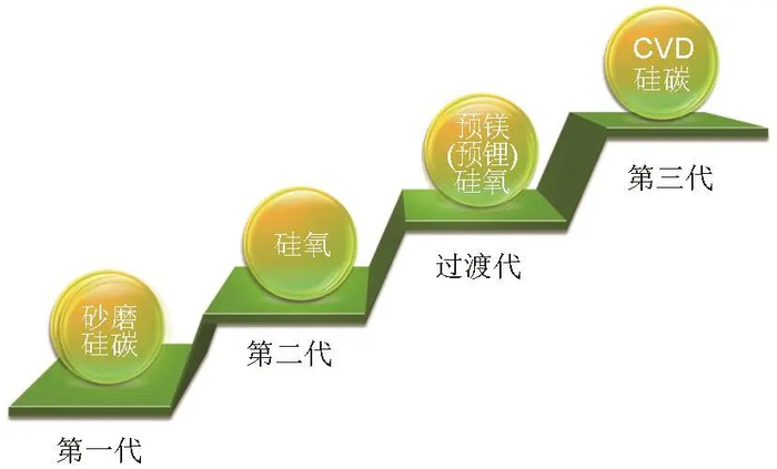 目前制备硅碳复合负极材料的方法有化学气相沉积(CVD)法、喷雾干燥法、镁热还原法、机械球磨法、溶胶-凝胶法等,虽然制备方法各有差异,但核心思想都是将硅纳米化并与碳结合构建相应的复合结构。由于硅基负极的体积膨胀和导电率低的问题得到解决,硅碳负极实现应用化。如图1所示,目前硅基负极技术路线主要经历了三代,第一代技术路线是通过机械球磨法将硅的尺寸减少至纳米级别来减小材料的体积膨胀,通过硅颗粒之间的空隙来缓冲材料的综合体积膨胀。从理论上来讲,如果能将硅纳米颗粒研磨至20 nm以下且不团聚,就能极大程度上地解决硅负极的体积膨胀问题。但事实证明这超越了工艺极限,机械球磨法作为第一代硅碳复合技术,球磨时难以球磨至20 nm以下且不发生团聚,粒径较大,容易引入杂质,电池容量衰减快,难以达到一些应用领域需求。为了提高电池容量和倍率性能,人们采取了一种折中方案,用硅氧替代硅碳,于是第二代技术路线得到发展。该路线采用纯硅和二氧化硅合成一氧化硅形成前驱体,在嵌锂脱锂过程中,其中的SiOx与Li先发生反应,生成单质Si、Li2O及锂硅酸盐,单质Si进一步与Li发生反应形成LixSi合金,进而产生可逆容量。而生成的Li2O和锂硅酸盐在后续的电化学循环过程中不再参与反应。这种通过化学反应生成的单质硅粒径达到了5 nm以下,颗粒间空隙更丰富,同时,形成的Li2O和锂硅酸盐不参与后续反应,无膨胀,从而提供了更大的应力缓冲空间。因此SiOx相比第一代的纳米硅材料,理论比容量较低,但在嵌锂过程中的体积膨胀大大减小(约118%),其循环性能得到较大提升。然而由于SiOx负极在充放电过程中会产生大量非活性物质,不可逆容量损失较大,首次库仑效率较低(70%)。