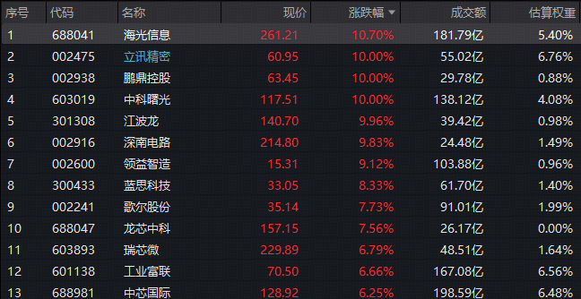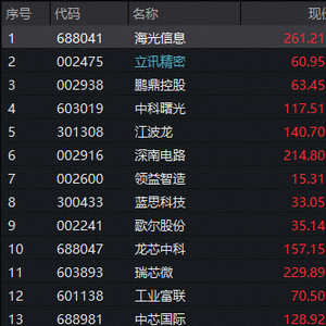周一(9月22日),电子板块大放异彩,消费电子+芯片双双爆发!代表电子龙头股行情的中证电子50指数涨超4%创历史新高,千亿市值龙头批量大涨!消费电子方面,立讯精密涨停逼近前高,鹏鼎控股涨停创新高,万亿巨头工业富联涨超6%创新高;芯片方面,海光信息涨超10%创新高,中科曙光涨停,江波龙涨超9%创新高,中芯国际涨超6%创新高!