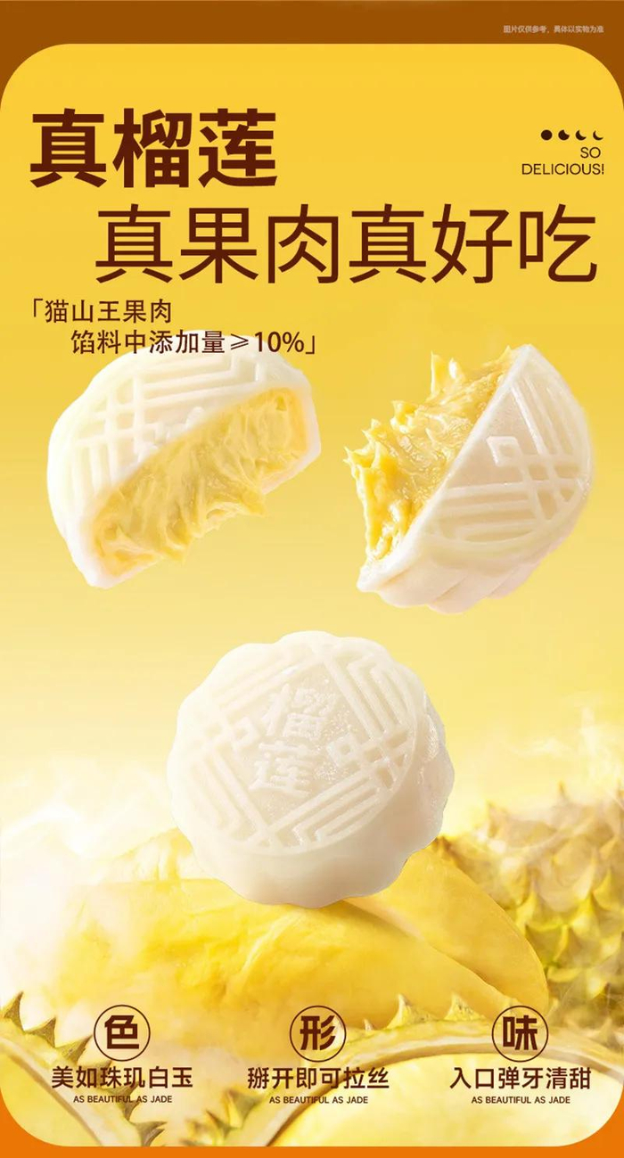 猫山王榴莲冰皮月饼,颠覆传统口感,果香浓郁、冰皮轻盈,有新意更有心意,送出去体面,吃起来过瘾,绝对让人记住这份独特心意。