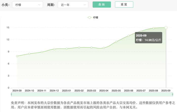 据全国农产品批发市场价格信息系统显示,截至9月22日,柠檬的全国批发均价在14.98元/公斤,比去年同期的7.87元/公斤上涨了将近一倍。
