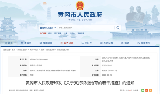 9月15日,黄冈市人民政府印发《关于支持积极婚育的若干措施》的通知。