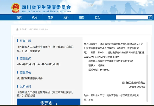 5月30日,四川省卫生健康委员会官网发布了关于《四川省人口与计划生育条例(修正草案征求意见稿)》公开征求意见。