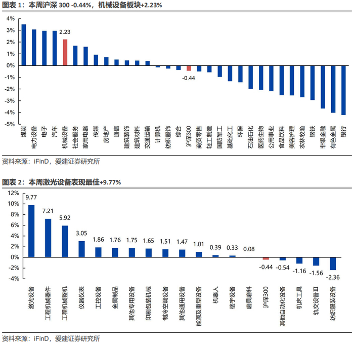 本周(2025/09/15-2025/09/19)沪深300指数-0.44%,其中机械设备板块+2.23%,申万一级行业排名5/31位。机械设备子板块中,激光设备+9.77%,表现最佳。