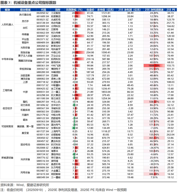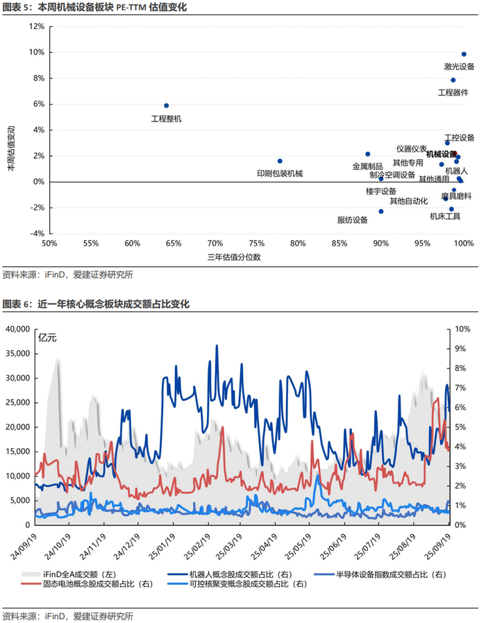 ■本周(2025/09/15-2025/09/19)沪深300指数-0.44%,其中机械设备板块+2.23%,申万一级行业排名5/31位。机械设备子板块中,激光设备+9.77%,表现最佳。本周机械设备行业PE-TTM估值+2.21%。子板块 PE-TTM 抬升幅度前三子板块为:激光设备+9.86%,工程器件+7.86%,工程整机+5.89%;回调幅度前三子板块为:服纺设备-2.28%,其他自动化-2.1%,轨道交通Ⅲ-1.6%。