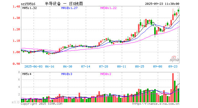 9月23日,截止午间收盘,半导体设备ETF(159516)涨0.75%,报1.352元,成交额4.90亿元。半导体设备ETF(159516)重仓股方面,北方华创截止午盘跌1.78%,中微公司涨0.01%,沪硅产业涨9.52%,华海清科涨1.07%,南大光电跌2.68%,拓荆科技涨2.15%,长川科技涨20.00%,中科飞测跌0.70%,安集科技跌2.55%,芯源微跌2.41%。