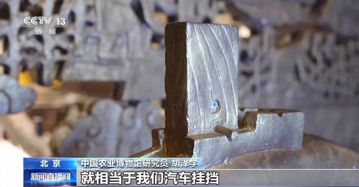 中国农业博物馆研究员 胡泽学:这个犁评,就相当于汽车挂挡,要犁浅,就把刻度往高提,犁镵离地面就高了,犁的时候就浅了。如果要犁深,就把犁评的刻度往低调。