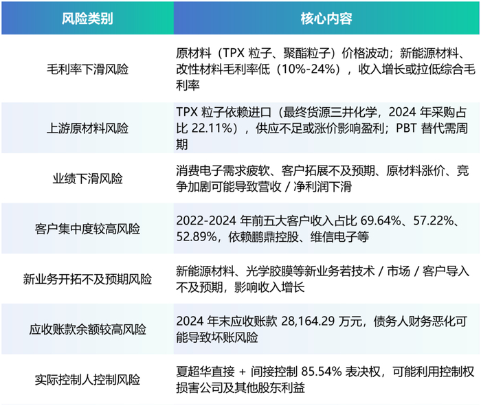 •FPC 行业下行风险:抗溢胶 / 强耐受性特种膜收入占比超 70%,依赖 FPC 行业,下游消费电子 / 新能源汽车需求萎缩影响业绩。