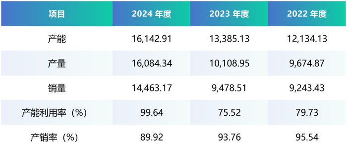 •产能利用率说明:2022-2023 年新投产 4 条生产线,产能爬坡导致利用率较低;2024 年需求增长,利用率回升至 99.64%。