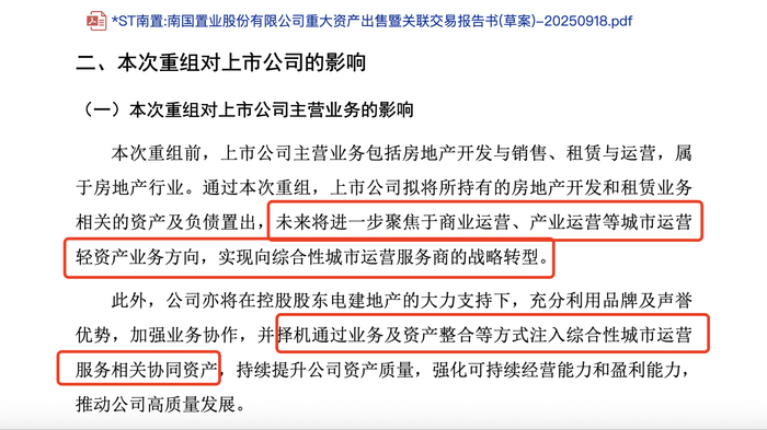 《财中社》还关注到,南国置业的主营业务规划中,提及择机通过业务及资产整合等方式注入综合性城市运营服务相关协同资产。