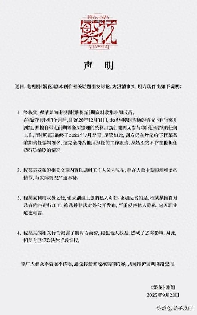 9月23日晚间,剧集《繁花》官方微博发布严正声明。