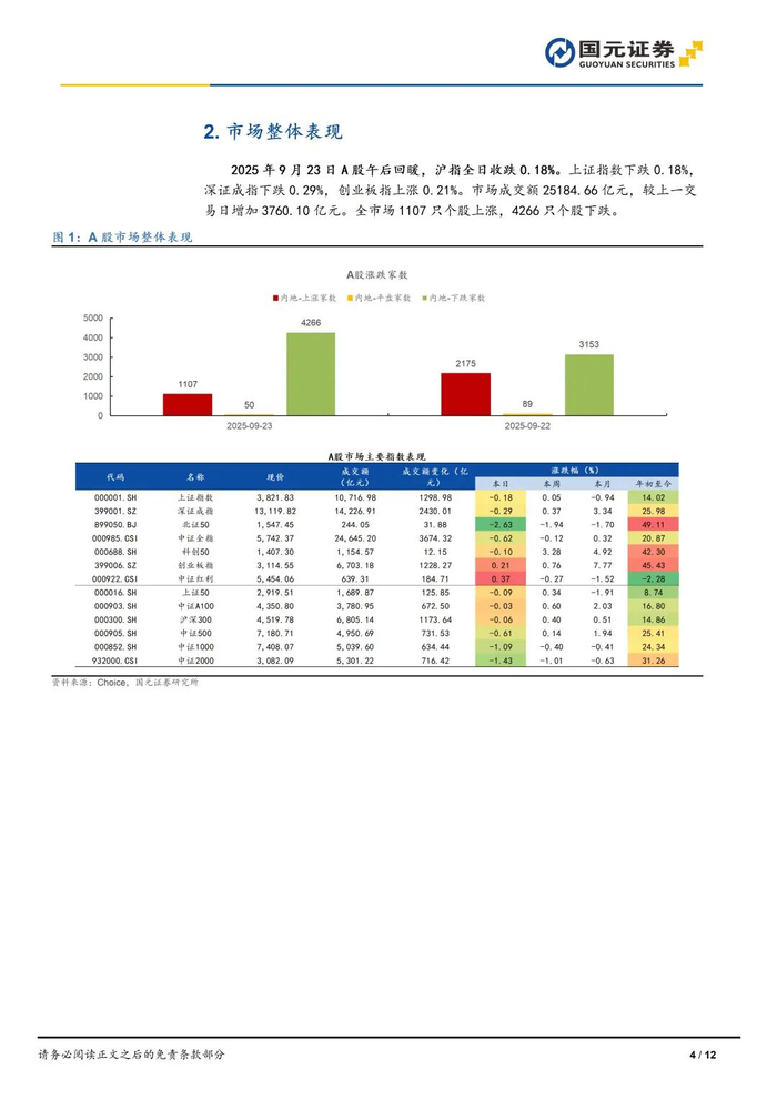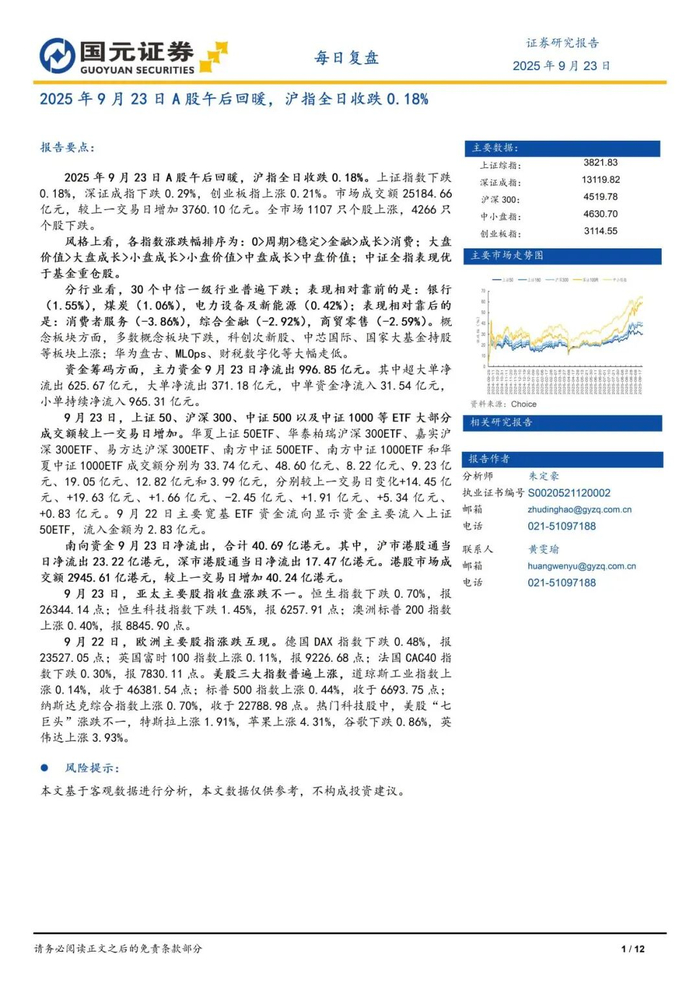 本报告摘自国元证券2025年9月23日已发布的《2025年9月23日A股午后回暖,沪指全日收跌0.18%》,具体报告及分析内容请详见报告。若因对报告的摘编等产生歧义,应以报告发布当日的完整内容为准。
