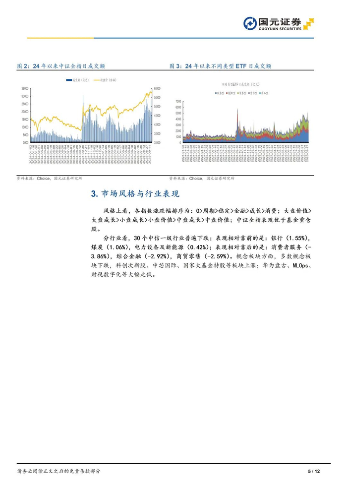 风格上看,各指数涨跌幅排序为:0>周期>稳定>金融>成长>消费;大盘价值>大盘成长>小盘成长>小盘价值>中盘成长>中盘价值;中证全指表现优于基金重仓股。