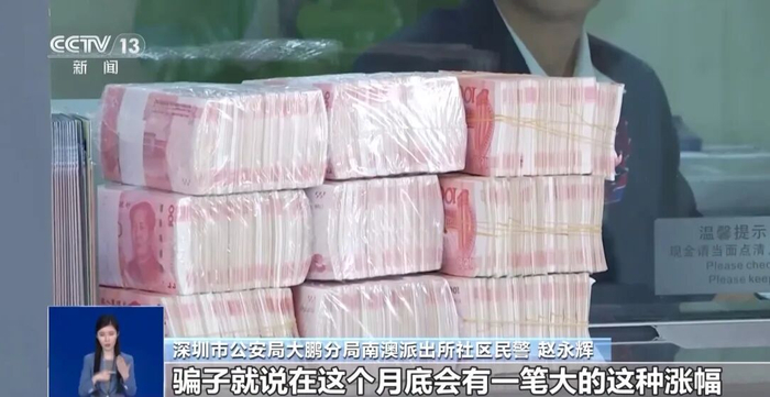 深圳市公安局大鹏分局南澳派出所社区民警赵永辉介绍,该男子8月初就已经被骗子洗脑,进入了该炒股平台和聊天群,“骗子说在这个月底会有一笔大的涨幅,每个人大概要投资50万到100万才会有更多的收益,该男子就自己跑到银行去,想把钱转给对方”。