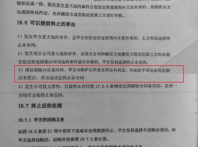 记者在仁怀市出具的“解除合同通知书”中看到:“依据PPP合同第19.6条第3项约定,解除PPP合同,通知送达之日起生效。”查阅合同,该项约定内容为:“项目期限内任意时间,甲方为维护公共安全和公共利益,可在给予项目公司足额补偿后,单方面决定终止本合同。”