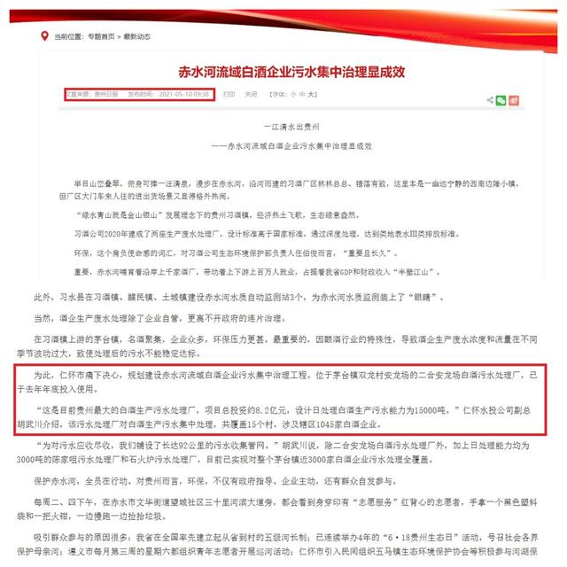 不论是贵州省还是仁怀市当地政府,都对这座位于茅台镇的废水处理厂项目给予高度重视,据央媒和贵州当地媒体报道:“安龙场白酒废水处理厂是贵州省十大污染源治理工程、贵州省最大的白酒生产废水处理厂,项目总投资约8.2亿元,设计日处理白酒生产污水能力1.5万吨。覆盖茅台镇15个村、涉及1045家白酒企业,基本可以解决周边所有酱香酒企业的污水处理问题。”
