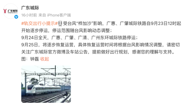9月24日全天,广惠、广肇、广清、广州东环城际铁路停运;