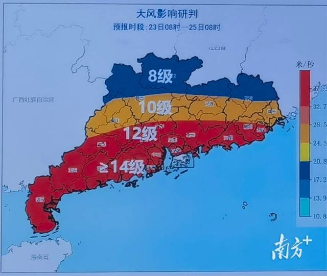 根据省气象台此前预测,24日起,随着台风逼近,广东全域都将被台风8级风圈覆盖,南部沿海甚至有超14级大风。24日,珠三角和粤西市县风力9~12级、阵风13~15级,台风中心经过的地区12~15级、阵风16~17级。从25日起,广东各地风力明显减弱。