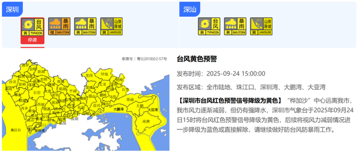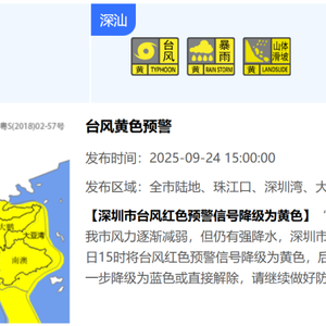【深圳市台风红色预警信号降级为黄色】“桦加沙”中心远离我市,我市风力逐渐减弱,但仍有强降水,深圳市气象台于2025年09月24日15时将台风红色预警信号降级为黄色,后续将视风力减弱情况进一步降级为蓝色或直接解除,请继续做好防台风防暴雨工作。