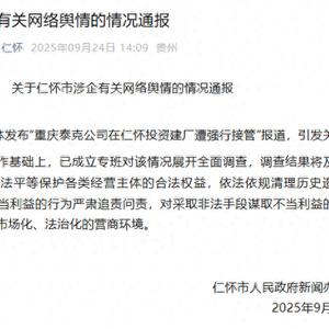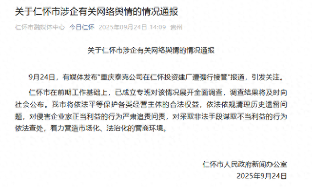 9月24日,仁怀市人民政府新闻办公室发布“关于仁怀市涉企有关网络舆情的情况通报”: