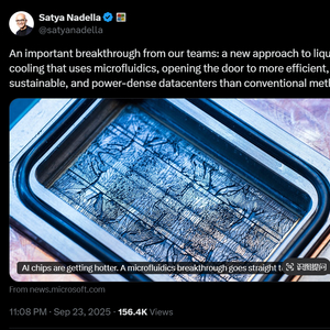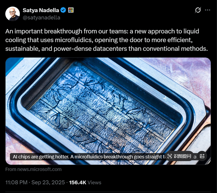 近日,微软首席执行官萨提亚·纳德拉(Satya Nadella)在社交平台上宣布,其团队已成功开发出微流体冷却技术——通过细如发丝的微小通道,直接将冷却液输送到芯片内部。