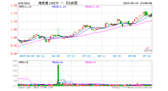 9月24日港股通100ETF(513900)份额减少100.00万份,最新份额1.17亿份,最新规模1.34亿元
