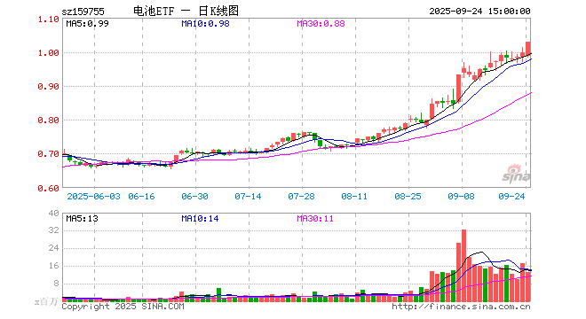 9月24日电池ETF(159755)份额增加2.27亿份,最新份额123.61亿份,最新规模126.83亿元