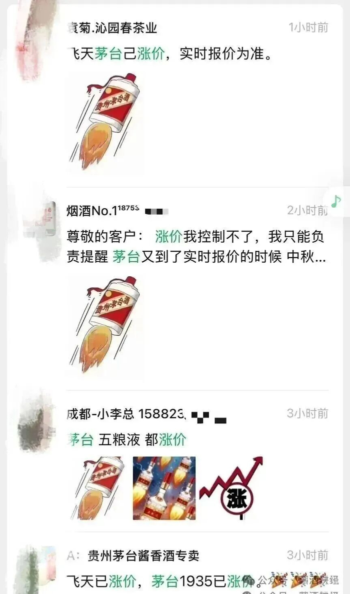从朋友圈的经销商动态可见,不仅飞天茅台报价上调,茅台1935等系列酒也同步跟进,这意味着市场需求的热度已从核心大单品向次高端产品蔓延,双节消费的“虹吸效应”正在显现。