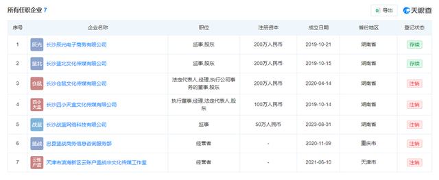 据此前报道,根据天眼查任职信息显示,蓝战非名下关联7家企业,仅2家为存续状态,分别是长沙辰光电子商务有限公司、长沙蓝北文化传媒有限公司,其余5家企业已注销,其中天津市滨海新区云账户蓝战非文化传媒工作室、长沙仓鼠文化传媒有限公司、长沙战蓝网络科技有限公司于近期注销。