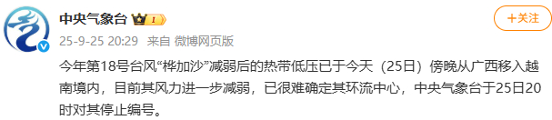 新京报讯 据中央气象台官博消息,今年第18号台风“桦加沙”减弱后的热带低压已于今天(25日)傍晚从广西移入越南境内,目前其风力进一步减弱,已很难确定其环流中心,中央气象台于25日20时对其停止编号。