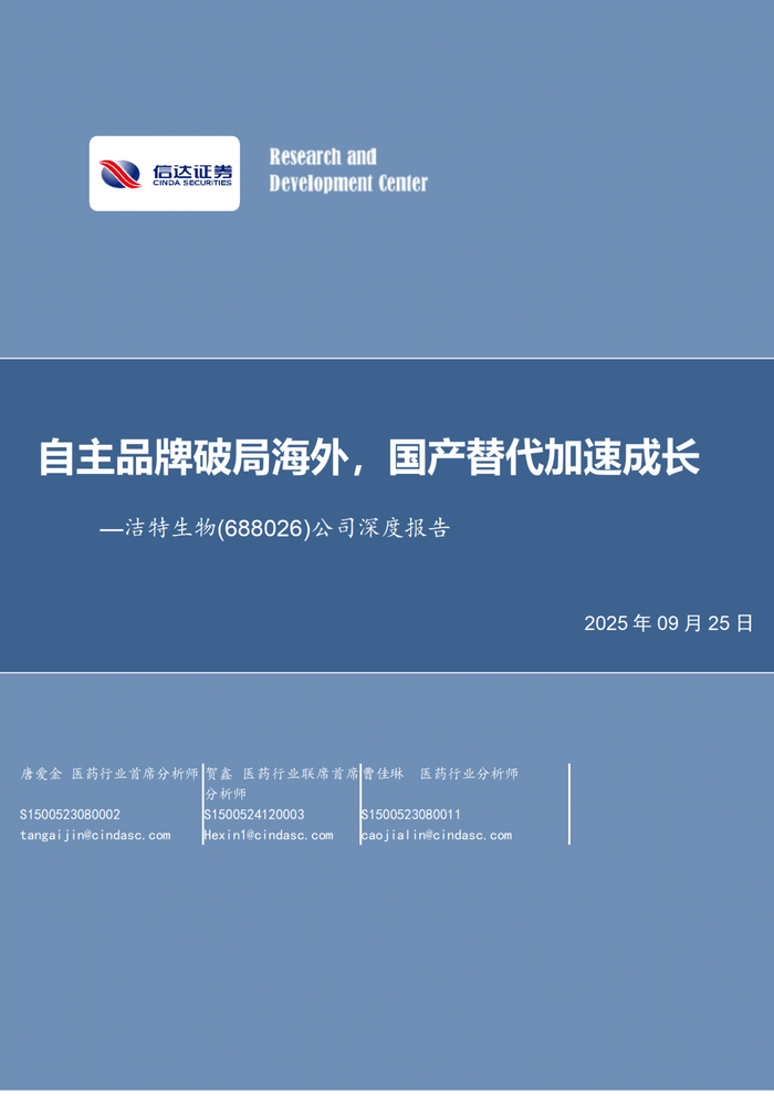 本文来自信达证券研发中心2025年9月25日发布的洁特生物(688026)公司深度报告《自主品牌破局海外,国产替代加速成长》,欲了解具体内容,请阅读报告原文,唐爱金S1500523080002,贺鑫S1500524120003,曹佳琳S1500523080011。