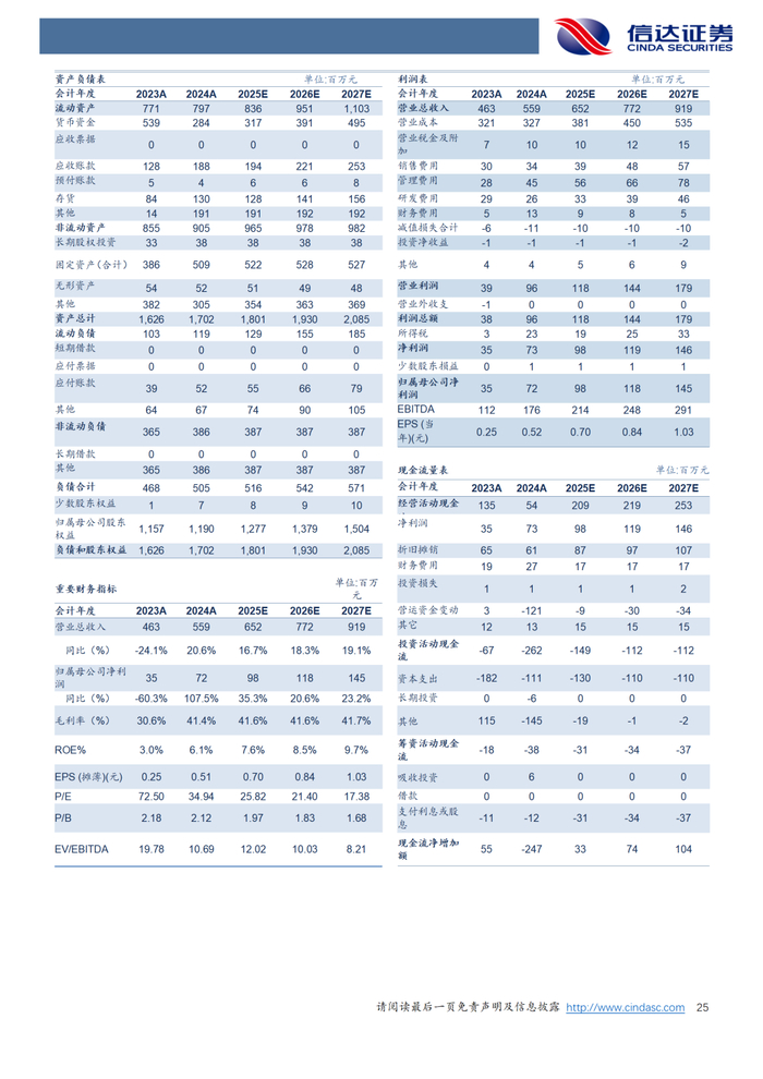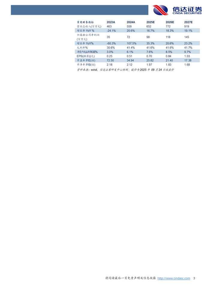 盈利预测与投资评级:我们预计公司2025-2027年营业收入分别为6.52亿元、7.72亿元、9.19亿元,同比增速分别为16.7%、18.3%、19.1%,2025-2027年实现归母净利润为0.98亿元、1.18 亿元、1.45亿元,同比分别增长35.3%、20.6%、23.2%,对应2025年9月24日股价PE分别为26、21、17倍,首次覆盖,给予“买入”投资评级。