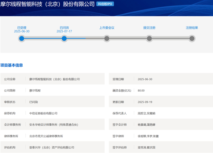 摩尔线程科创板IPO申请于今年6月30日获上交所受理,历经两轮问询,仅耗时88天便顺利过会。公司本次IPO的保荐机构为中信证券、会计师事务所为安永华明、律师事务所为竞天公诚。