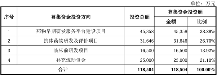 此次科创板IPO,百奥赛图拟募集资金11.85亿元,较最初申报的18.93亿元有所调减,所募资金将用于药物早期研发服务平台建设项目、抗体药物研发及评价项目、临床前及临床研发项目以及补充流动资金。