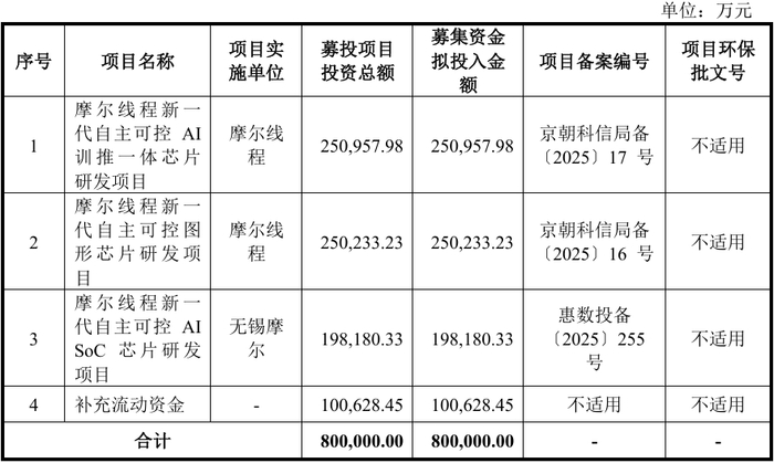 此次科创板IPO,摩尔线程拟募集资金80亿元,成为年内募资规模最大的IPO上会项目。所募资金将用于摩尔线程新一代自主可控AI训推一体芯片研发项目、摩尔线程新一代自主可控图形芯片研发项目、摩尔线程新一代自主可控AISoC芯片研发项目及补充流动资金。
