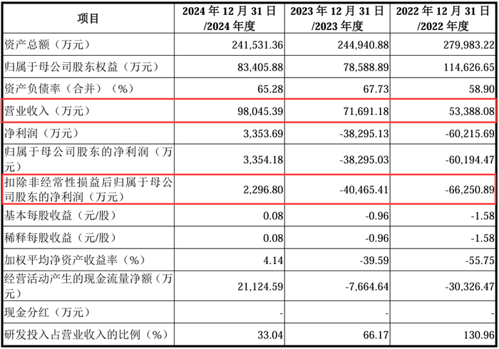 2022年-2024年,公司实现营业收入5.34亿元、7.17亿元及9.80亿元,营收复合增长率达35.52%;实现扣非后归母净利润分别为-6.63亿元、-4.05亿元及2,296.80万元,2024年公司首次实现年度盈利。