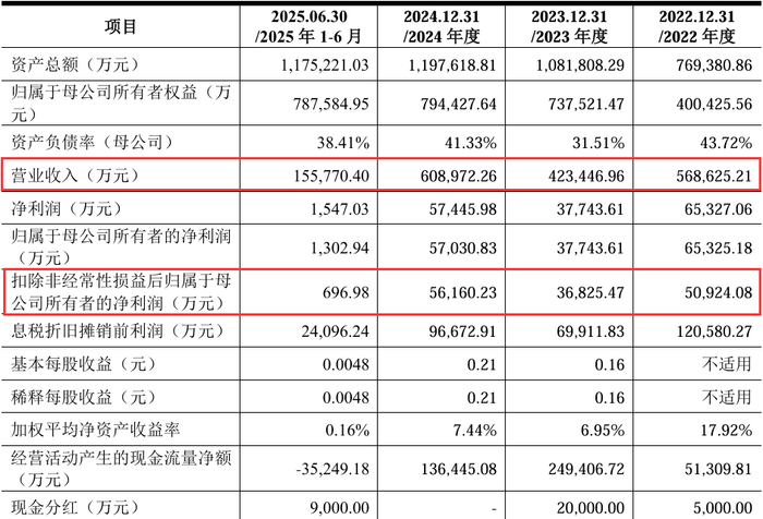 2022年至2025年1-6月,公司实现营业收入56.86亿元、42.34亿元、60.90亿元及15.58亿元;实现扣非后归母净利润分别为5.09亿元、3.68亿元、5.62亿元及696.98万元。2023年经营业绩有所下滑,2024年公司恢复稳步增长。