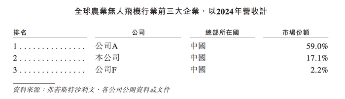 据弗若斯特沙利文,极飞在全球以及中国的农业无人机市场中位列第二,2024年市占率分别为17.1%和20.8%,但行业龙头大疆在农业无人机领域市占率超过50%,形成明显的规模与品牌优势。