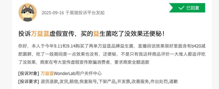 《国际金融报》记者注意到,多位消费者在社交平台反映服用该产品后对减肥并无帮助,甚至还出现肚子疼、体重倒增的现象。在黑猫投诉平台上搜索“万益蓝”关键字,出现1576条记录,不少投诉原因为“涉嫌虚假宣传”。