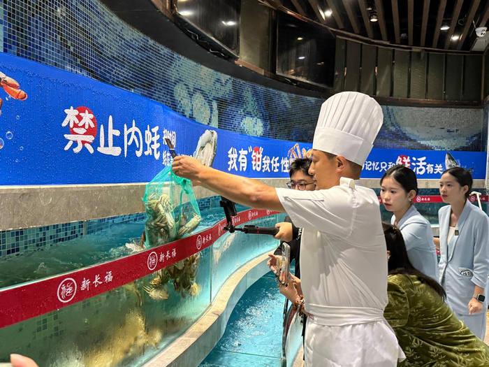 9月26日,江苏阳澄湖迎来2025年开湖启捕日,第一批从东湖湖心水域捞起的“头担蟹”,带着湖水的清润与水草的淡香上市了。“你看这刚卸的蟹,青背白肚、金爪黄毛,还带着阳澄湖东湖湖心的水草清香——这可是今年开湖后的第一批‘头担蟹’,凌晨从江苏捞起,中午就到长沙餐桌了!”9月26日上午,新长福诚兴园店的水产区里,门店负责人李玉学正对着刚开箱的大闸蟹介绍,泡沫箱掀开的瞬间,鲜活的蟹钳轻轻挥舞。