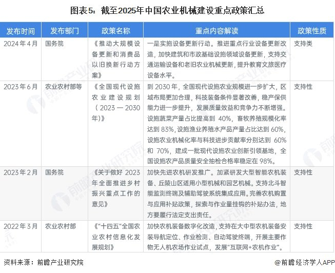 农业是我国立国的根本,一直以来都受到国家和政府的重视。为了提升我国农业现代化水平,我国政府机构出台了一系列政策措施提升农业机械化水平,推动智慧农业机械发展。截至2025年重点政策汇总如下: