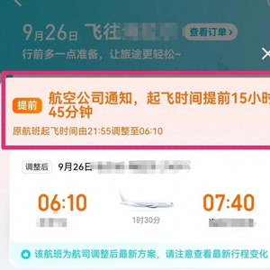 “常遇航班延误,却头回碰到提前15小时起飞,实在太离谱了!”9月27日,市民周女士向封面新闻记者吐槽了自己近期一段意外的航空出行经历 —— 原定于晚间起飞的航班,突然被通知提前十几个小时启航,不仅打乱了既定行程,还迫使她不得不临时调整住宿计划。
