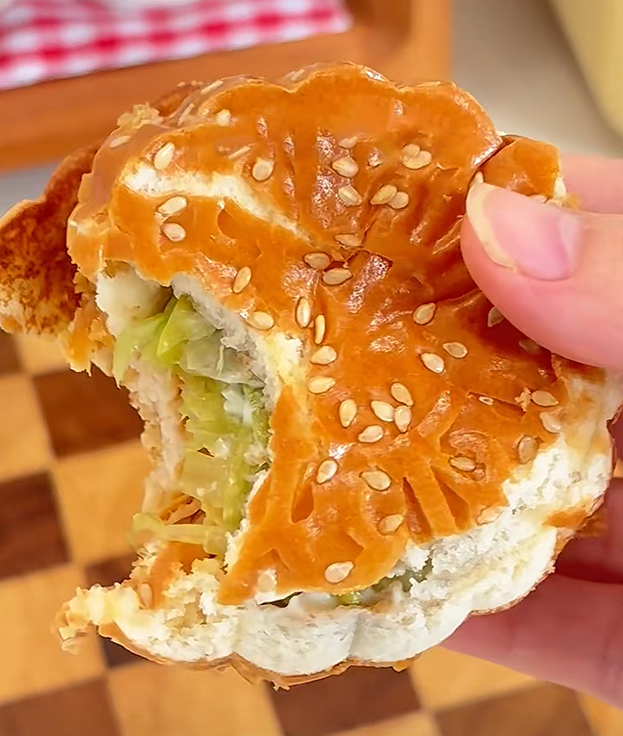 更有“脑洞大开”的网友,将一个圆滚滚的小汉堡塞入月饼模具,压出了一个和传统月饼外形几乎一模一样的“汉堡月饼”。
