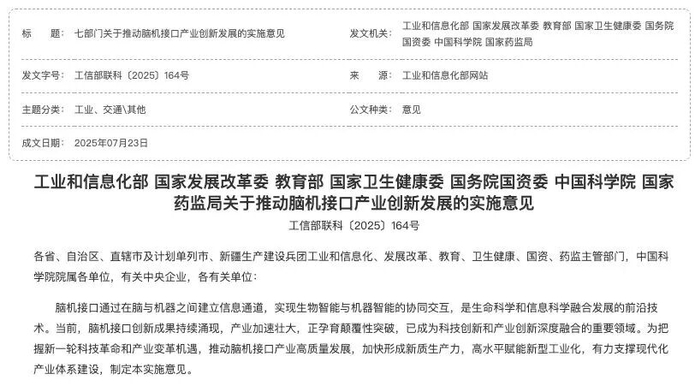 工信部等七部分发布关于推动脑机接口产业创新发展的实施意见